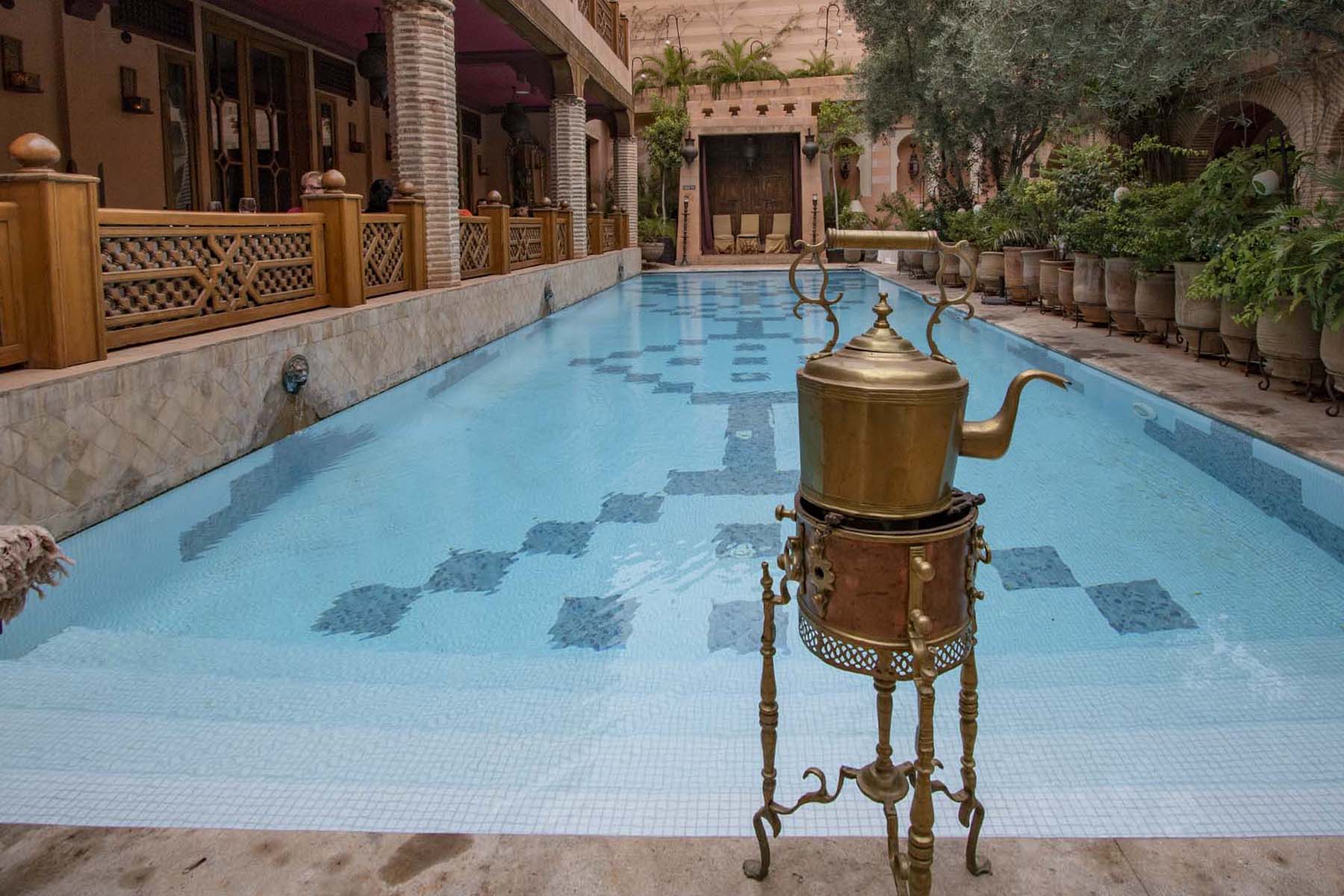 IMG_0458PoolSTR Published January 12, 2020 at 1800 × 1200 in La Maison Arabe, Marrakech Pool and antique tea pot, La Maison Arabe, Marrakech