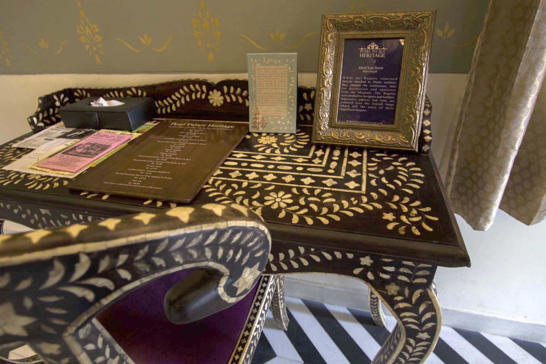 IMG_8052InlayWood Published July 24, 2017 at 1800 × 1200 in Pearl Palace Heritage Boutique Guesthouse, Jaipur Wooden table with mother of pearl inlay, Khwabgah suite, Pearl Palace Heritage Boutique Guesthouse, Jaipur, India