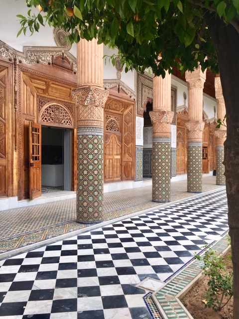 IMG_7911 Published January 14, 2020 at 480 × 640 in Marrakech – city tour and historic hotels Marble tiled walkway and columns around the courtyard garden, Dar el Bacha, Marrakech