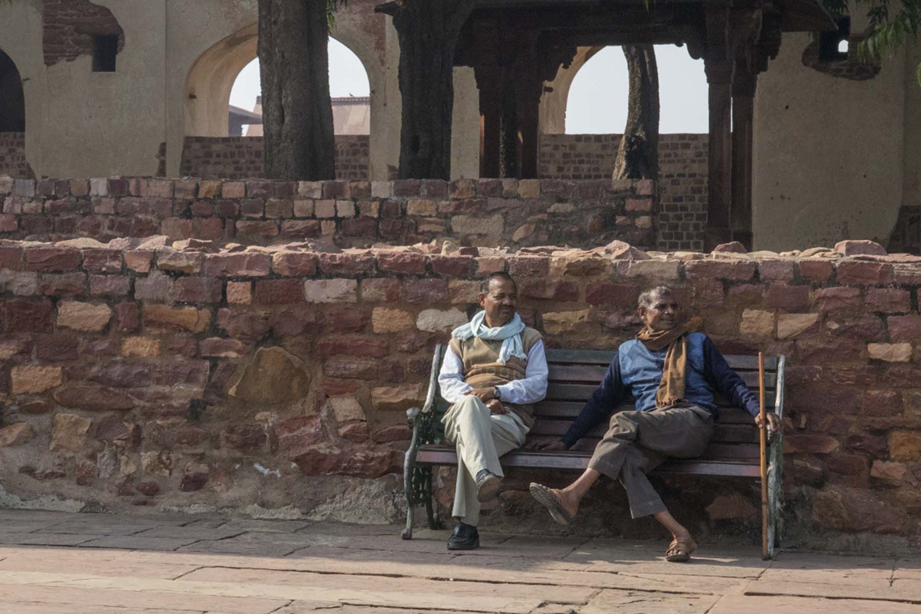 IMG_7217TwoMen Published June 24, 2017 at 1800 × 1200 in Agra – Agra Fort, Taj Mahal & Fatehpur Sikri Two men chatting on a bench, Fatehpur Sikri, India