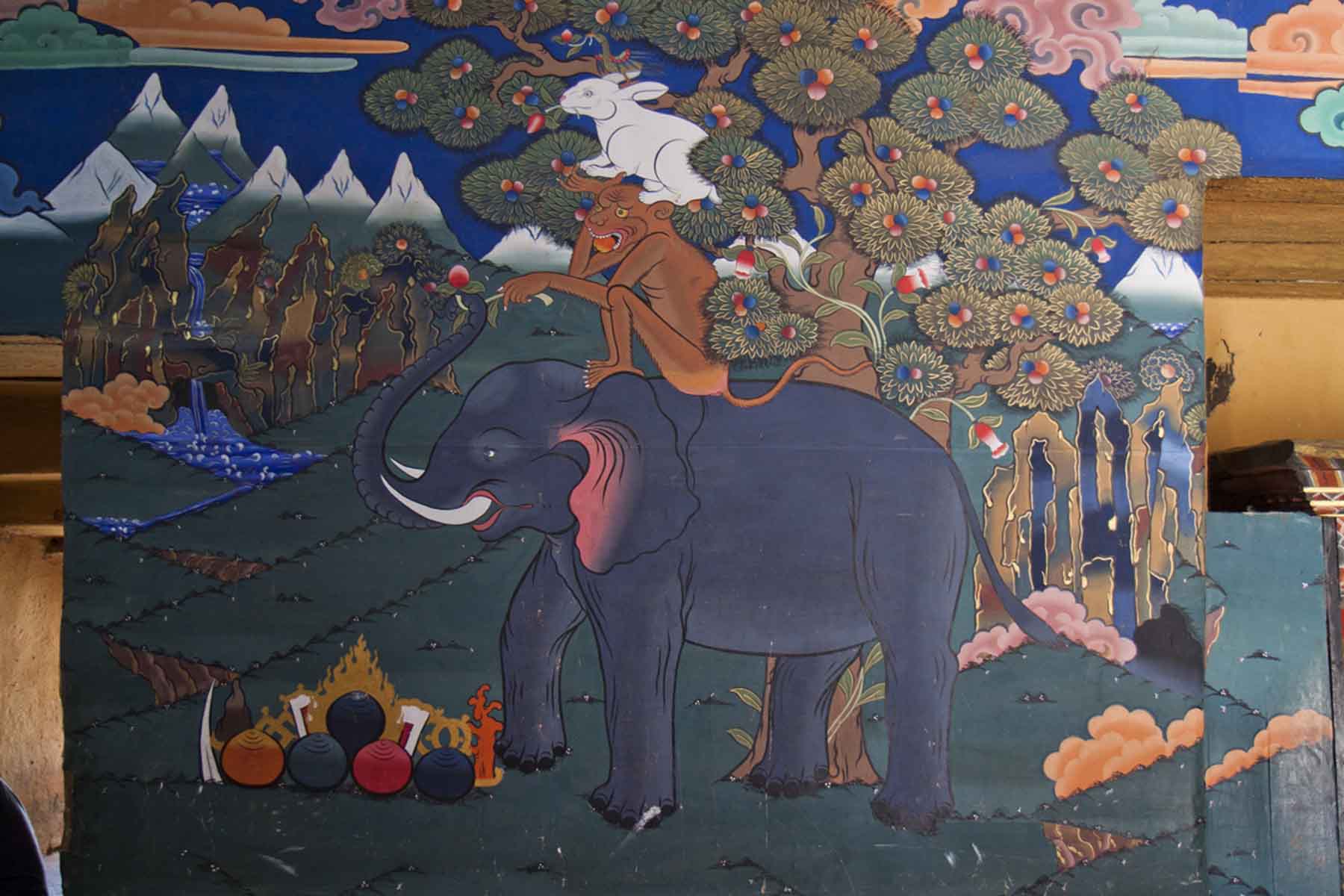 IMG_2066FourFriends Published January 20, 2016 at 1800 × 1200 in Bhutan (Part 2) – Paro’s Tsechu Festival Painting of ‘Four Friends’ of Bhutanese fables