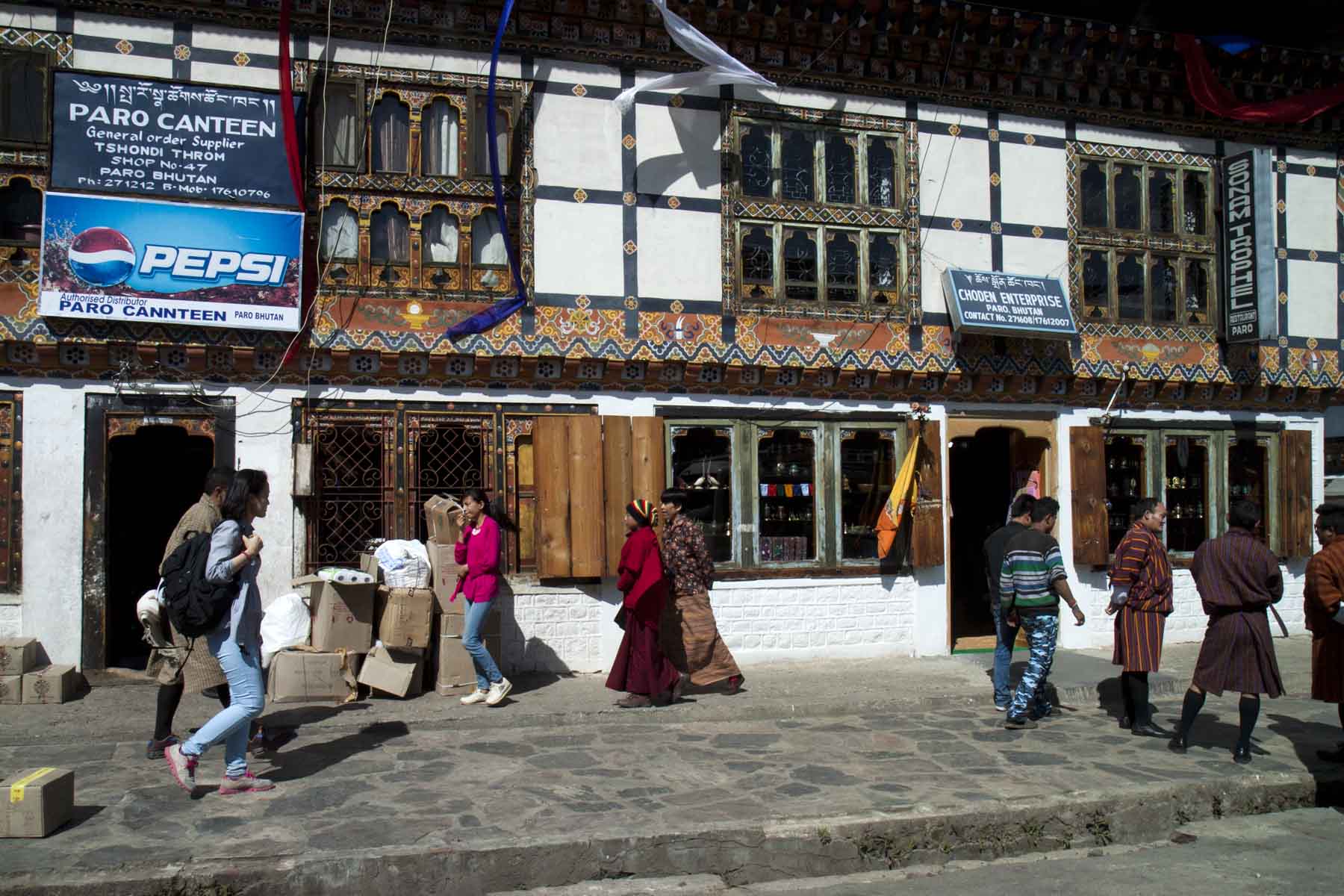 IMG_2167ParoStreet Published January 20, 2016 at 1800 × 1200 in Bhutan (Part 2) – Paro’s Tsechu Festival Main street of Paro..with a Pepsi influence, Bhutan