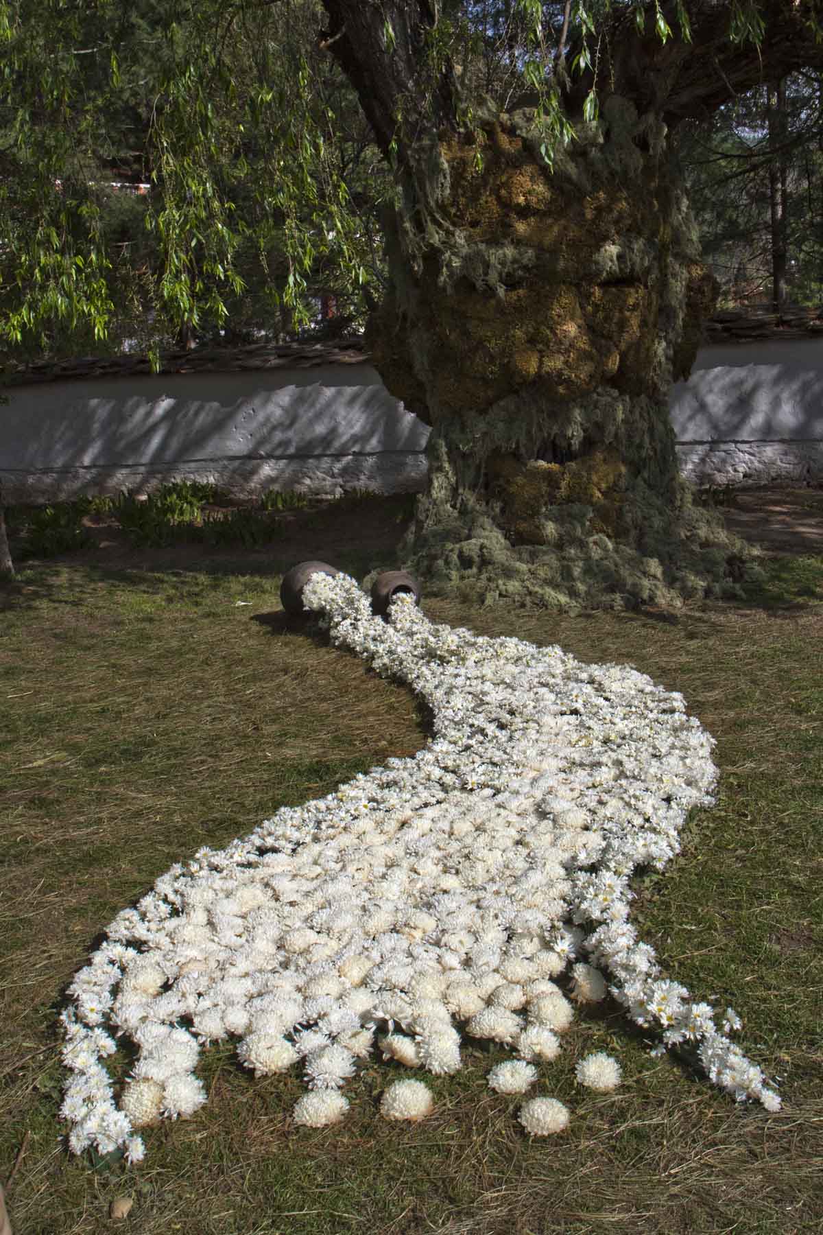 IMG_2248TreeMan Published January 20, 2016 at 1200 × 1800 in Bhutan (Part 2) – Paro’s Tsechu Festival Tree man and spilled jug of flowers at Paro Flower Show, Bhutan