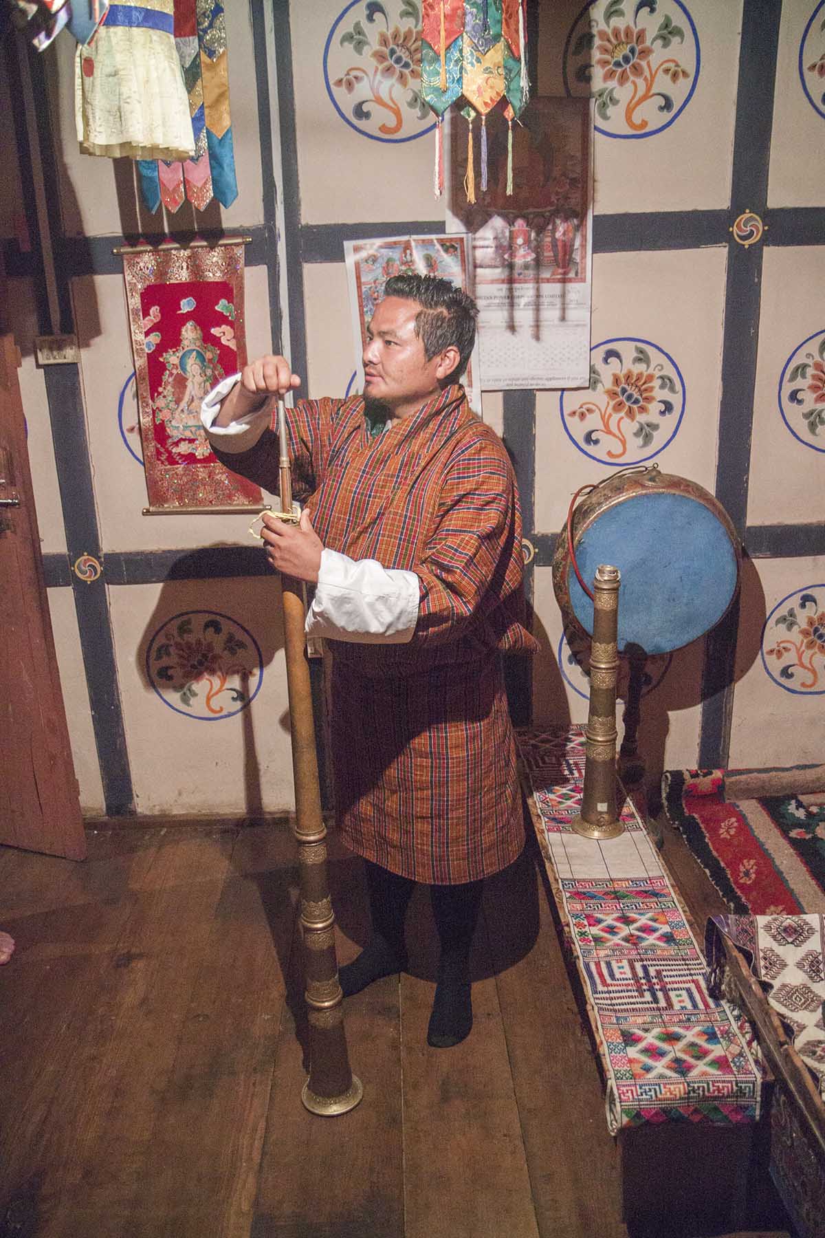 IMG_2334TRumpet Published January 21, 2016 at 1200 × 1800 in Bhutan (Part 2) – Paro’s Tsechu Festival Pema with a traditional trumpet, farmhouse shrine room, Bhutan