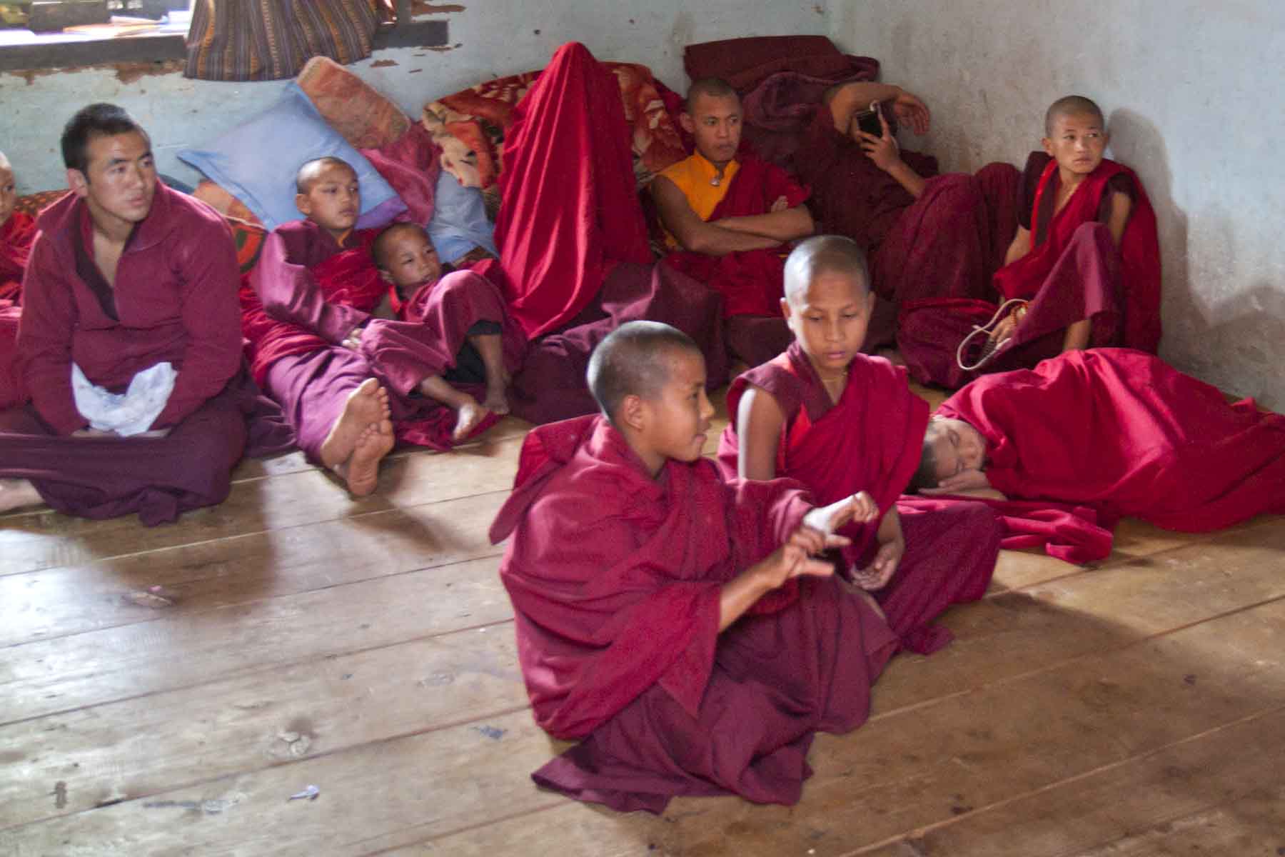 IMG_3251WatchingTV Published February 7, 2016 at 1800 × 1200 in Bhutan (Part 4) – Punakha Boy monks relaxing watching TV at Chimi Lhakhang Monastery, Bhutan