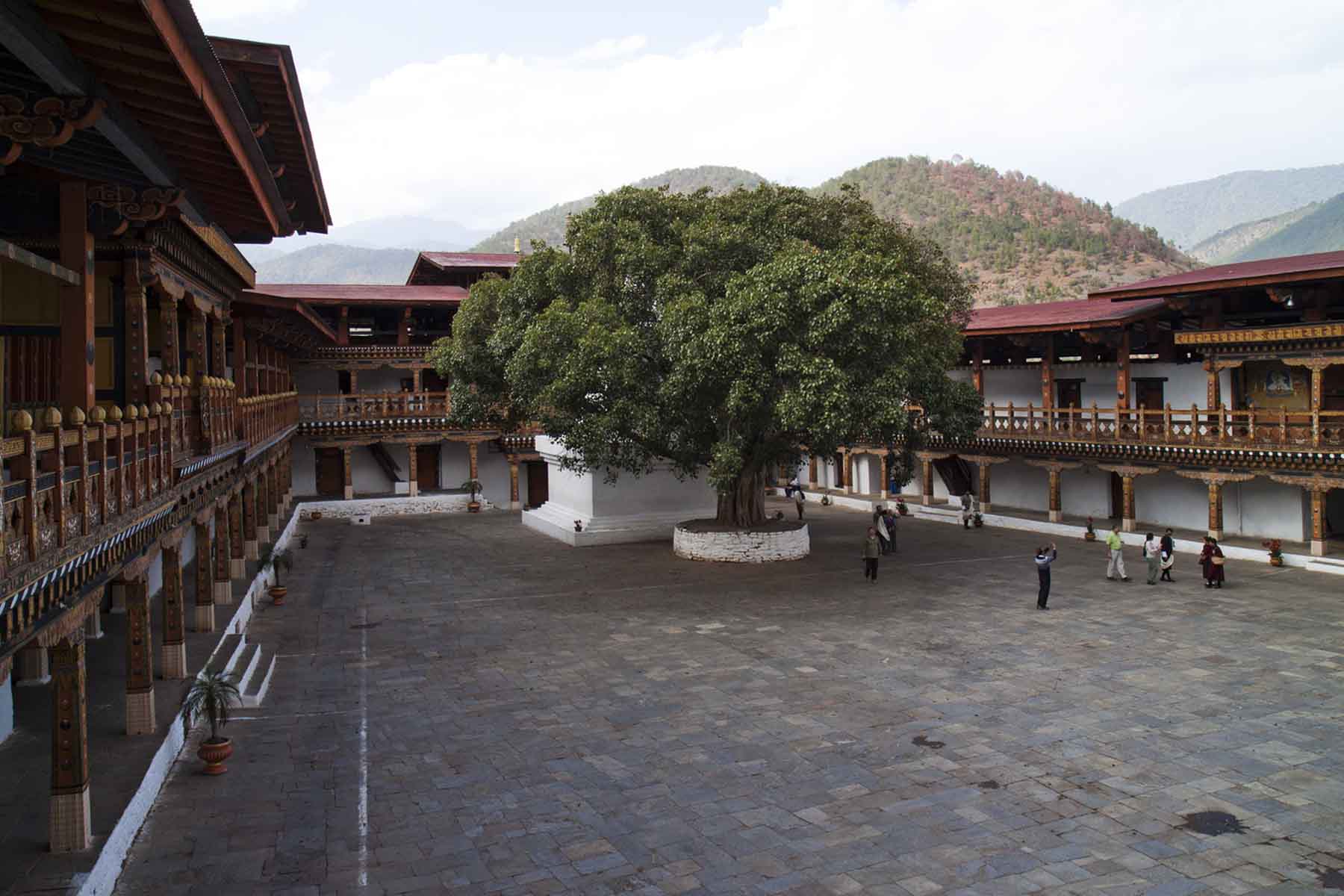 IMG_3400TreeCourtyard Published February 7, 2016 at 1800 × 1200 in Bhutan (Part 4) – Punakha Beautifully decorated courtyard complete with Bodhi tree, Punakha Dzong, Bhutan