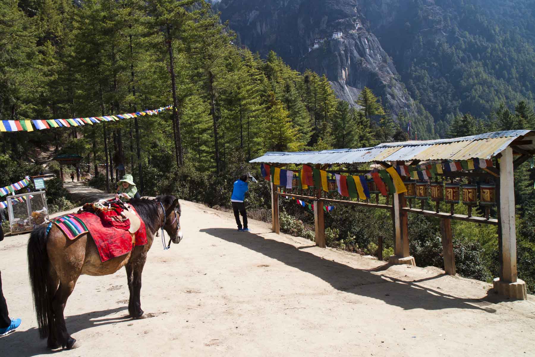 IMG_4302Stop Published March 28, 2016 at 1800 × 1200 in Bhutan (Part 6) – Tiger’s Nest Monastery Rest point, with prayer flags, prayer wheels and the monastery in the distance, Bhutan