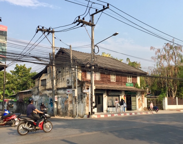 IMG_7181 Published September 25, 2019 at 640 × 502 in Chiang Mai (Part 1) – Arrival and Initial Explorations Wooden building and power lines, Chiang Mai, Thailand