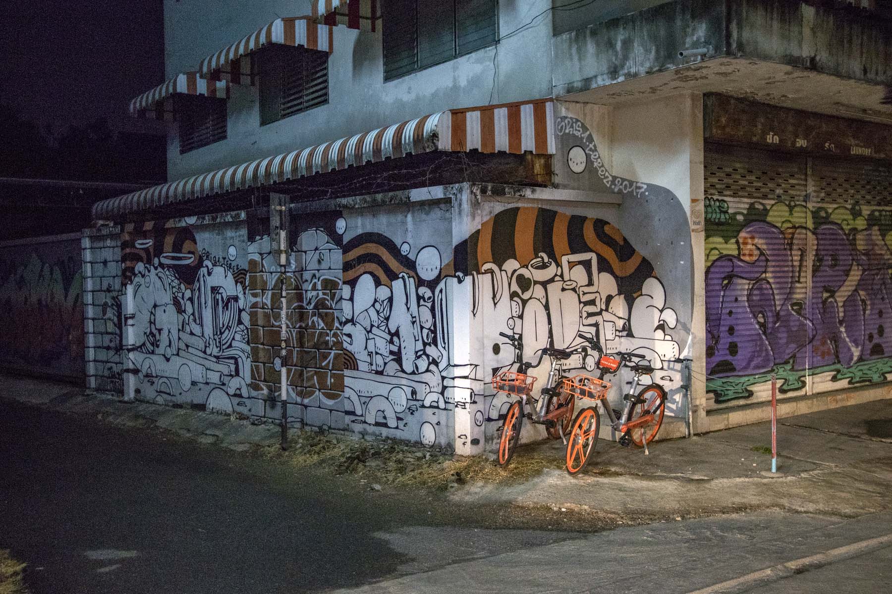 IMG_1420BikesOrange Published September 26, 2019 at 1800 × 1200 in Chiang Mai (Part 2) – Temples, Walking and Food Orange bikes and street art, Chiang Mai, Thailand