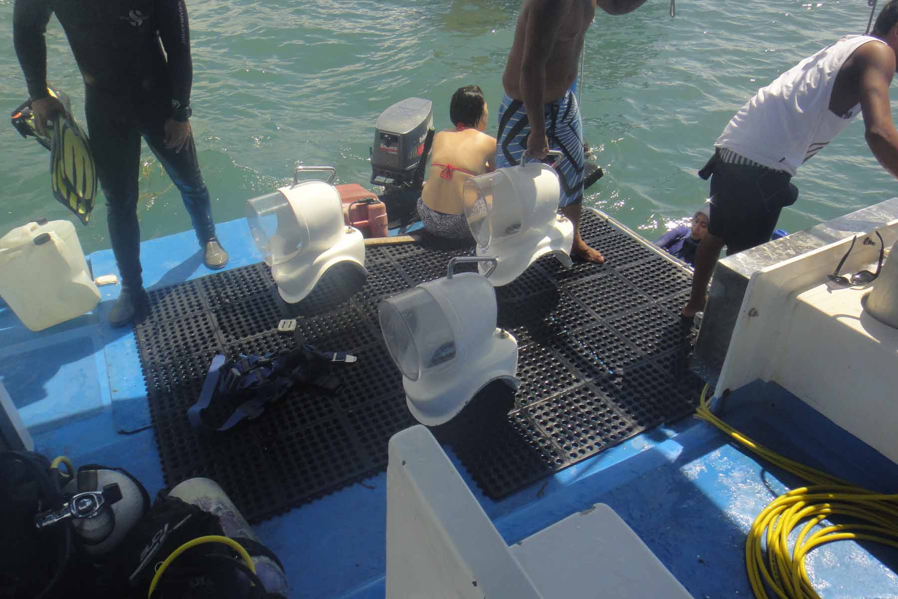 DSC05646Headsets Published April 17, 2014 at 1800 × 1200 in Day trip to Nusa Dua & Ulu Watu The helmets awaiting fresh underwater walkers