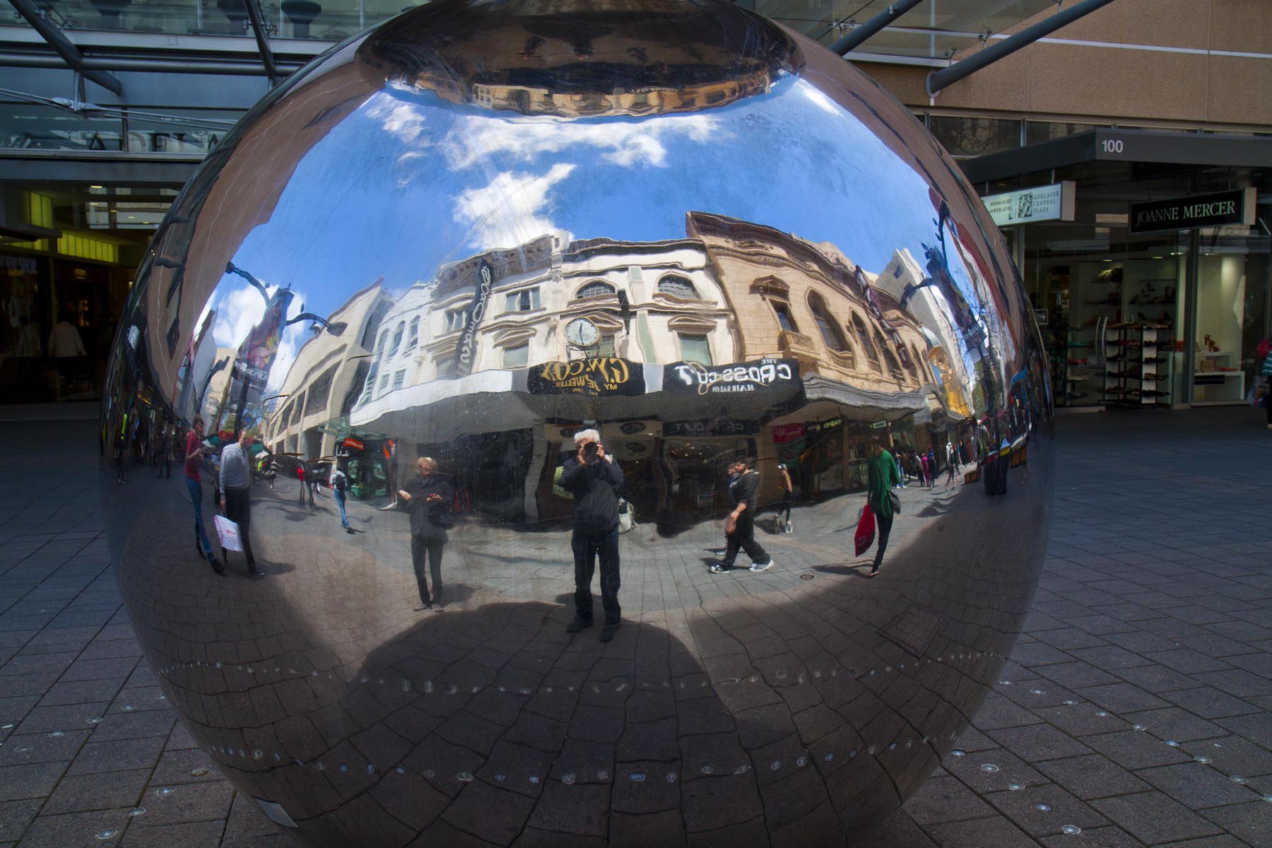 IMG_7040SelfPortraitRundleMall Published October 3, 2012 at 1800 × 1200 in Adelaide, North Terrace John’s image in the shiny ball sculpture in Rundle Mall