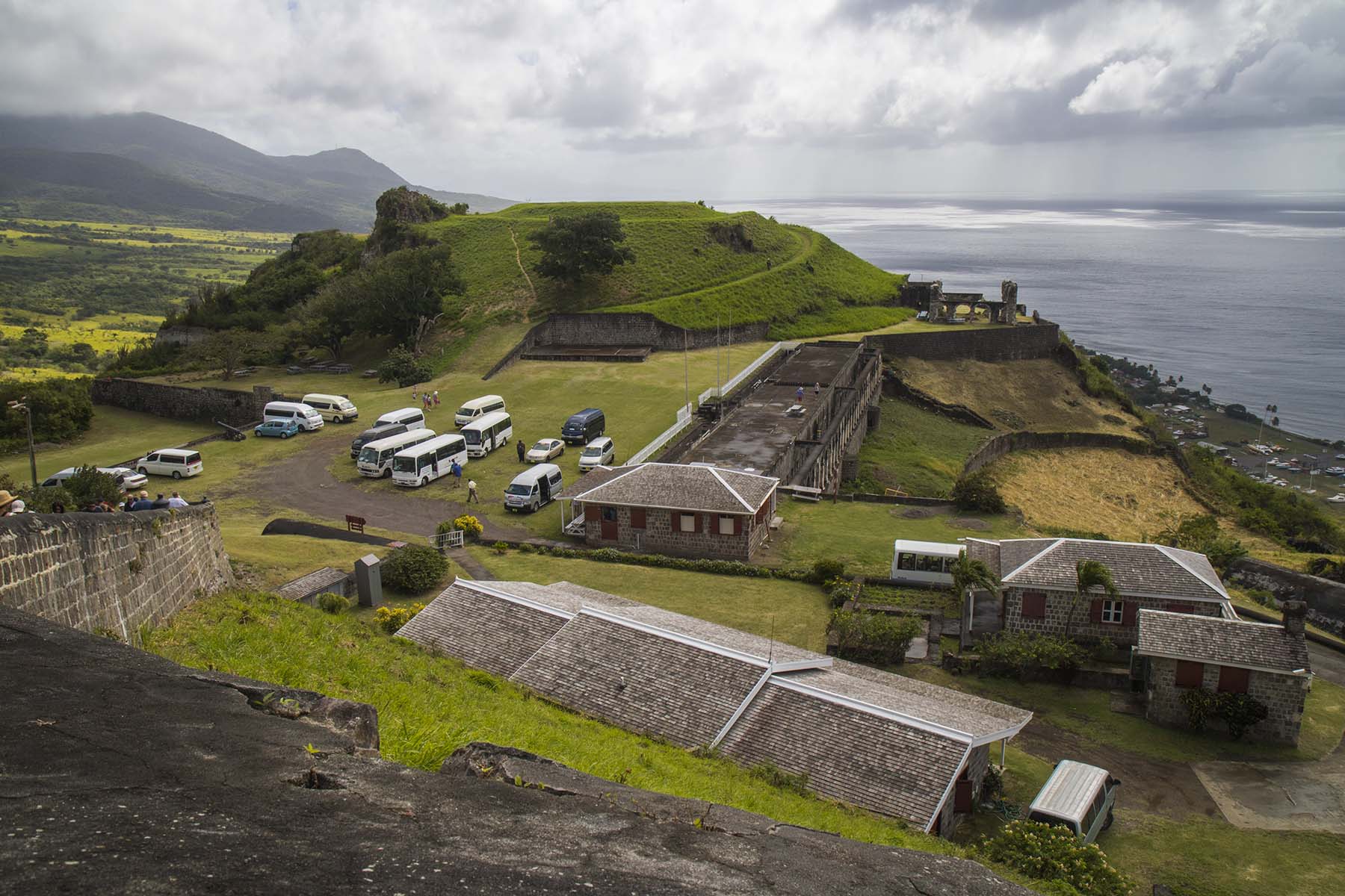 IMG_0861ViewDown Published April 17, 2017 at 1800 × 1200 in Caribbean Cruise (Part 2) – St Martin, St Kitts, St Vincent’s, Tobago Views of outer buildings and tour buses, Brimstone Fort, St Kitts, Caribbean