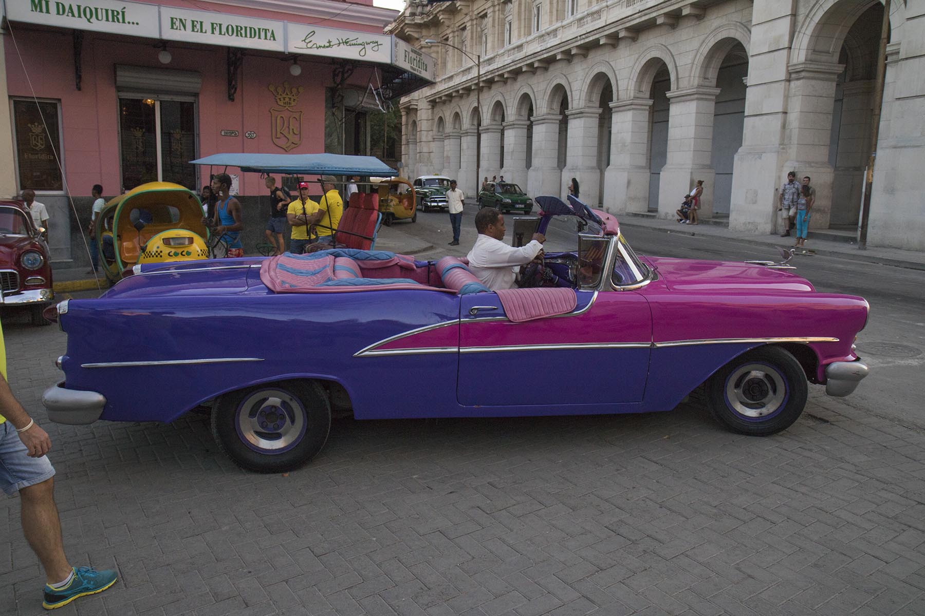 IMG_4476Classic Published July 14, 2016 at 1800 × 1200 in Havana (Part 1) – Arrival in Cuba Purple and pink convertible outside Floridita, Havana, Cuba