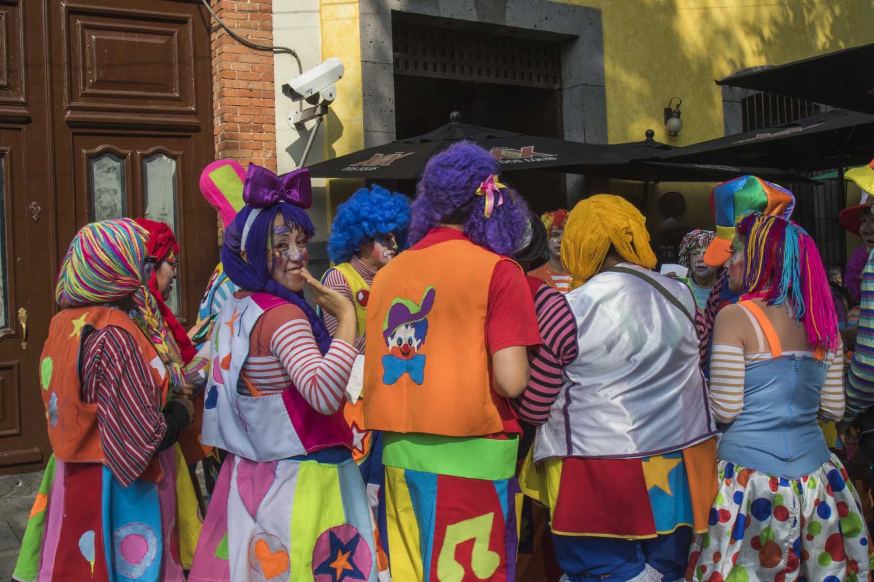 IMG_1109Clowns Published May 27, 2016 at 1800 × 1200 in Mexico City (Part 3) – San Angel to Coyoacan Cheeky clowns regrouping, Jardin Centenaria, Mexico City