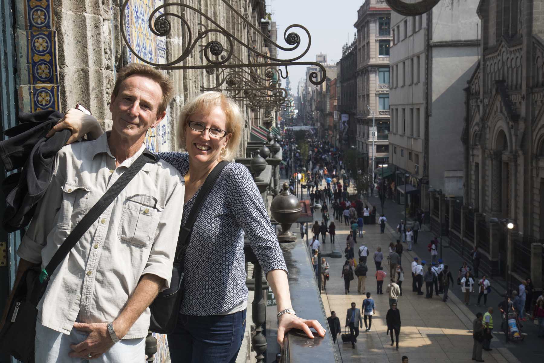 IMG_1354NicAnd Published June 5, 2016 at 1800 × 1200 in Mexico City (Part 4) – Centro Historico Nic and Al and the view down the Madero from Casa de los Azulejos (House of Tiles), Mexico City