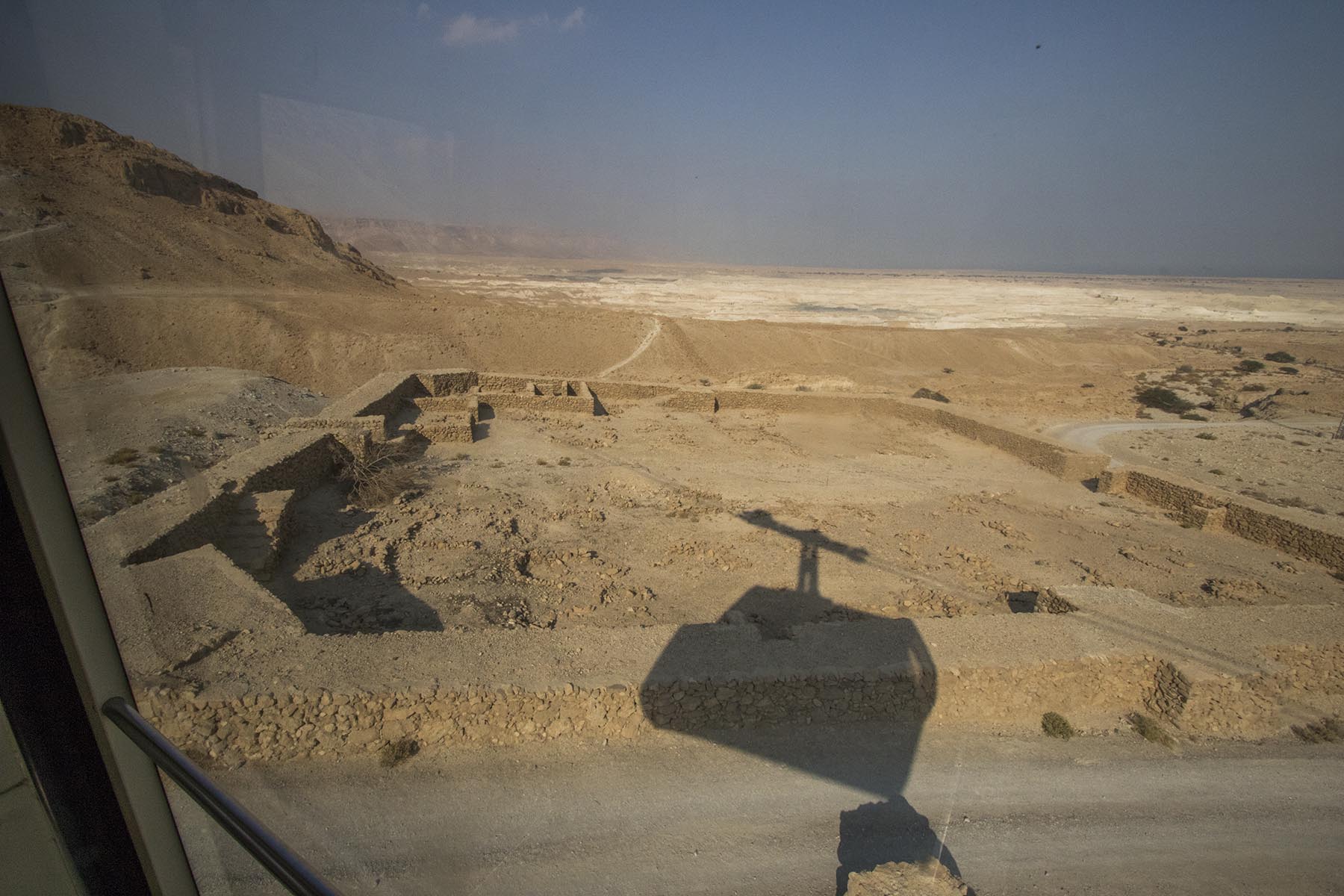 IMG_6728MasadaCableCar Published December 24, 2018 at 1800 × 1200 in Jordan to Israel – Border Crossing, Masada, Qumran Cable car shadow ascending Masada, Israel