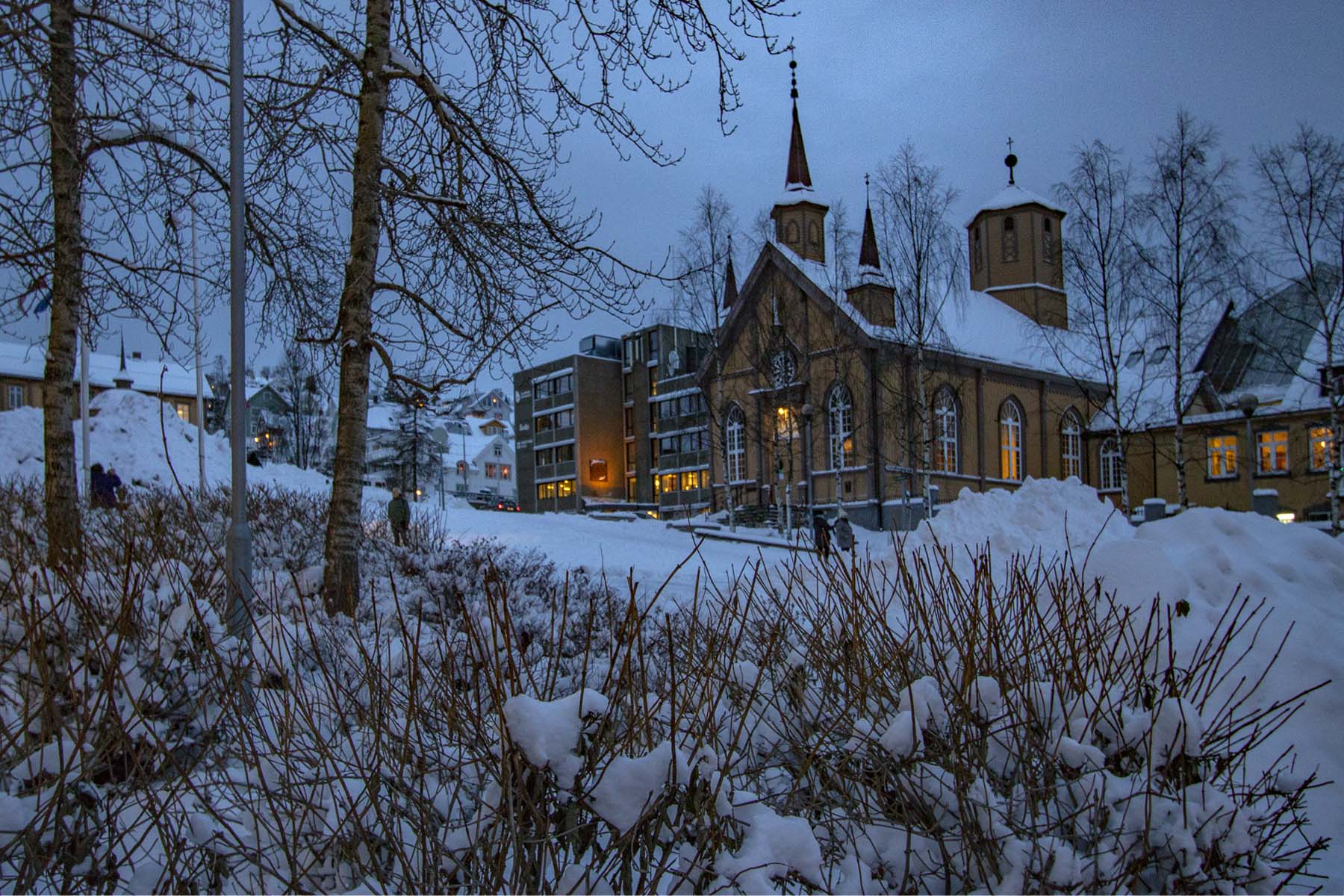 IMG_5241Spire Published March 3, 2019 at 1800 × 1200 in Tromso, Norway Bushes and trees in foreground of Roman Catholic Territorial Prelature of Tromso, Norway