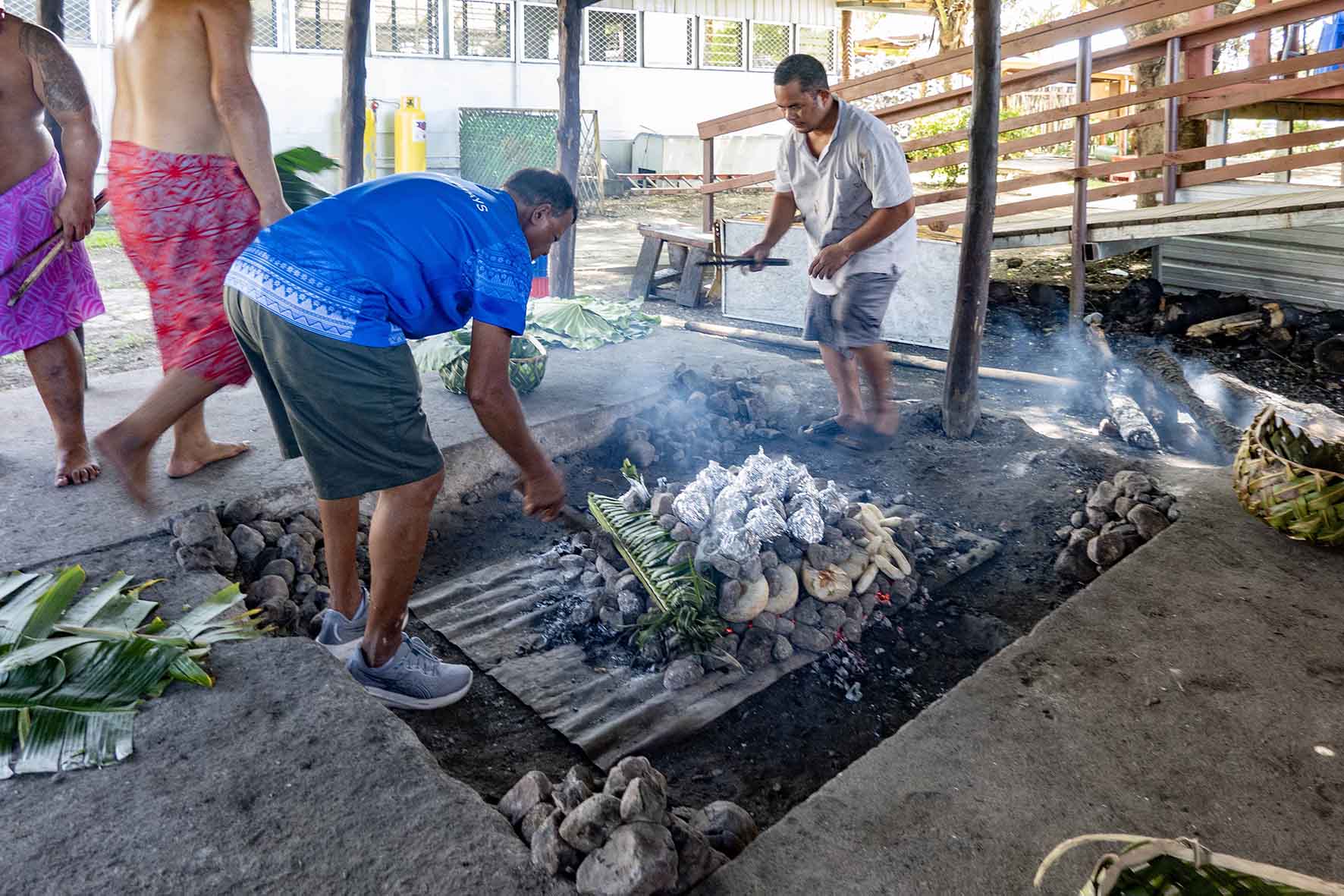SJB06002 copyBBQ_RED Published February 1, 2026 at 1772 × 1181 in Apia, Samoa Putting the food parcels in the ‘umu’, Samoan Cultural Village, Apia
