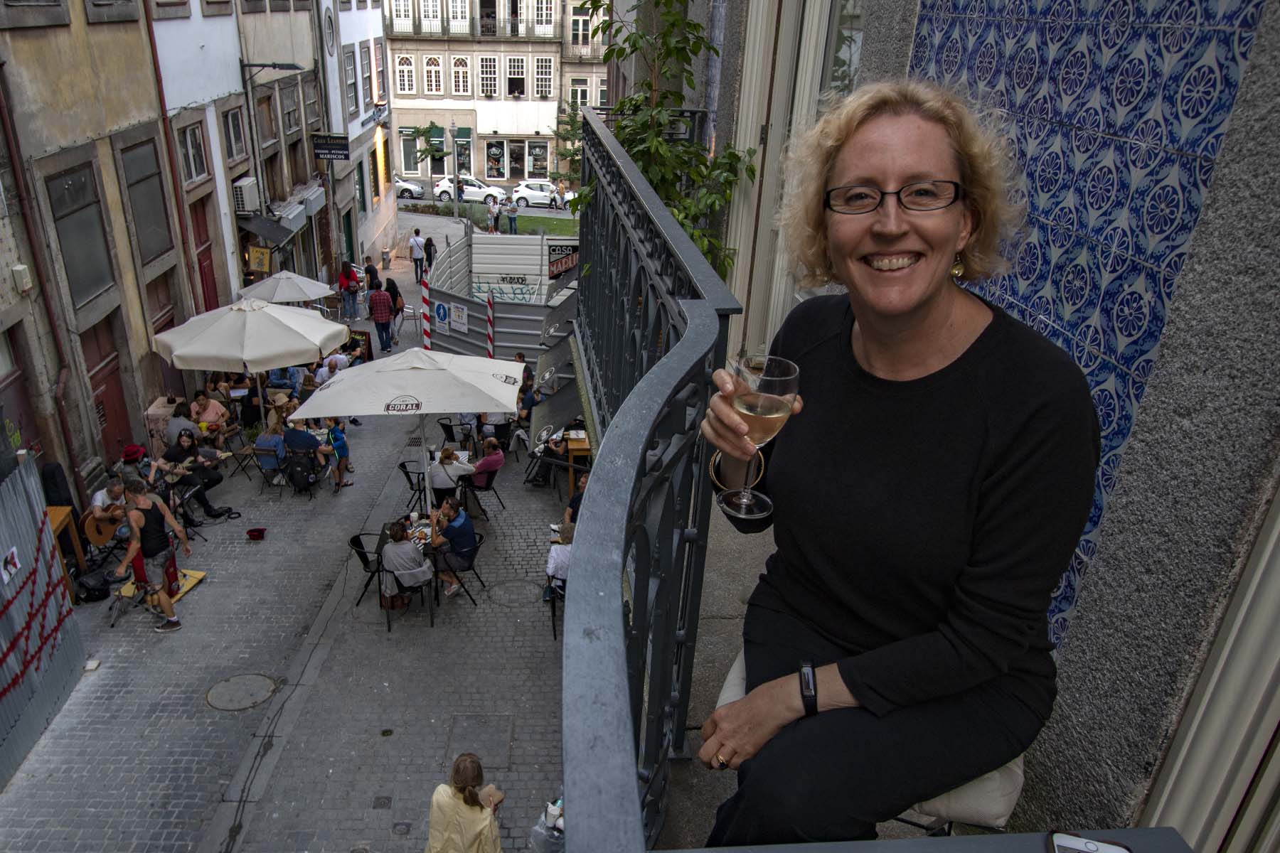 IMG_5197NicBalcony Published June 18, 2023 at 1800 × 1200 in Porto, Portugal (Part 2) – River Cruise and Old City Nic on balcony, wine in hand, listening to the band, Porto, Portugal