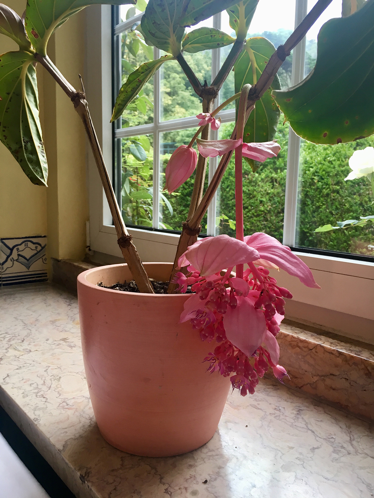 IMG_8669 Published April 11, 2023 at 1299 × 1733 in Sintra, Portugal Pink potted plant on the breakfast room window sill, Hotel Sintra Jardim, Portugal