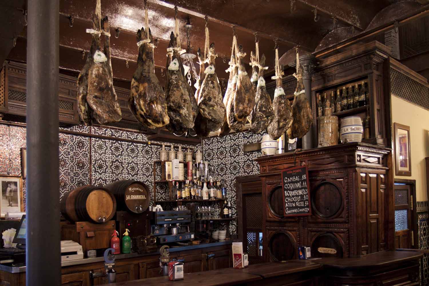 IMG_1334OldestPub Published June 27, 2014 at 1500 × 1000 in Seville, Spain – Arrival & the Cathedral The ancient jamon hanging in El Rinconcillo, Seville
