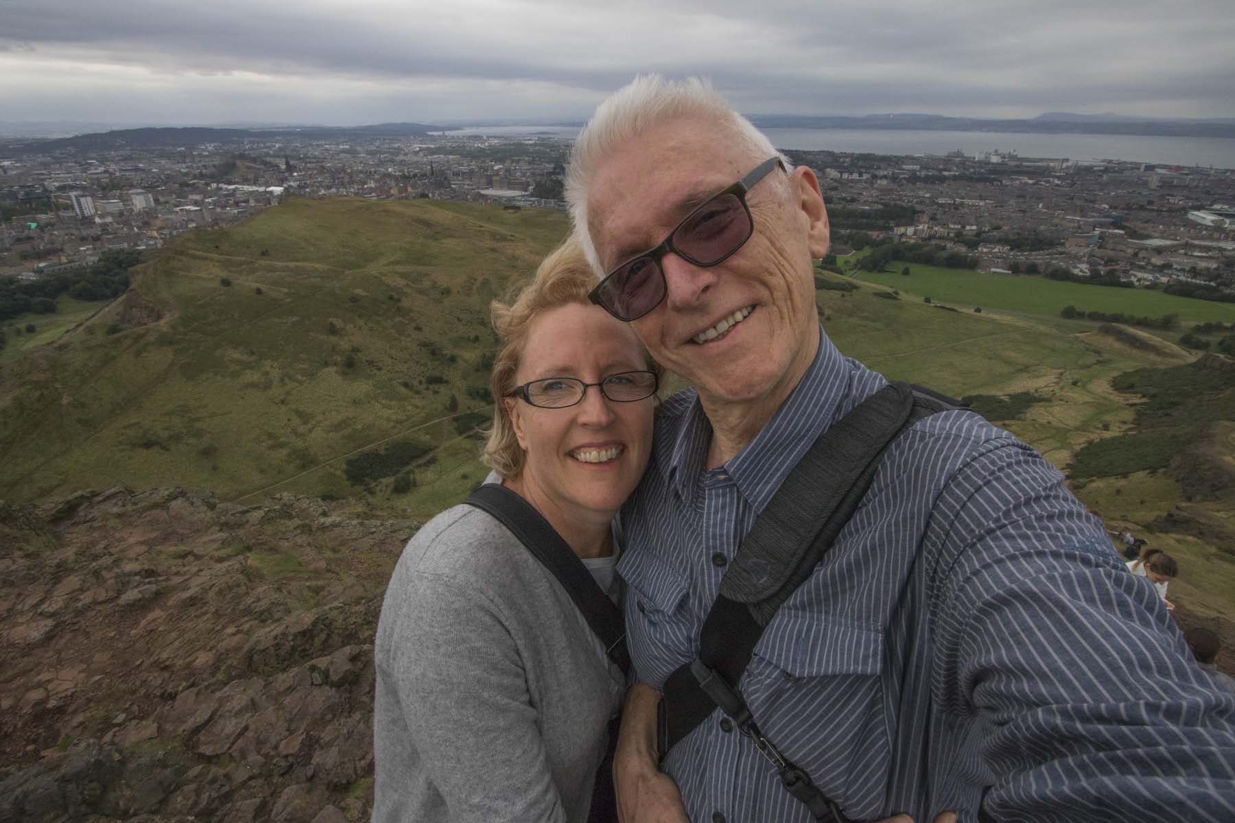 IMG_0285ArthursSeatN&J Published May 15, 2017 at 1800 × 1200 in Edinburgh (Part 1) – Edinburgh Castle, Palace of Holyroodhouse & Arthur’s Seat Wind-blown Nic & John atop Arthur’s Seat, Edinburgh, Scotland