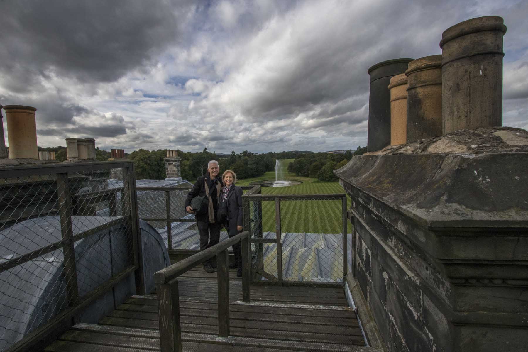 IMG_1126ChimneyPots Published May 18, 2017 at 1800 × 1200 in Edinburgh to Loch Lomond – Hopetoun House, Linlithgow Palace & Stirling Castle Nic and John among the chimney pots, Hopetoun House, Scotland