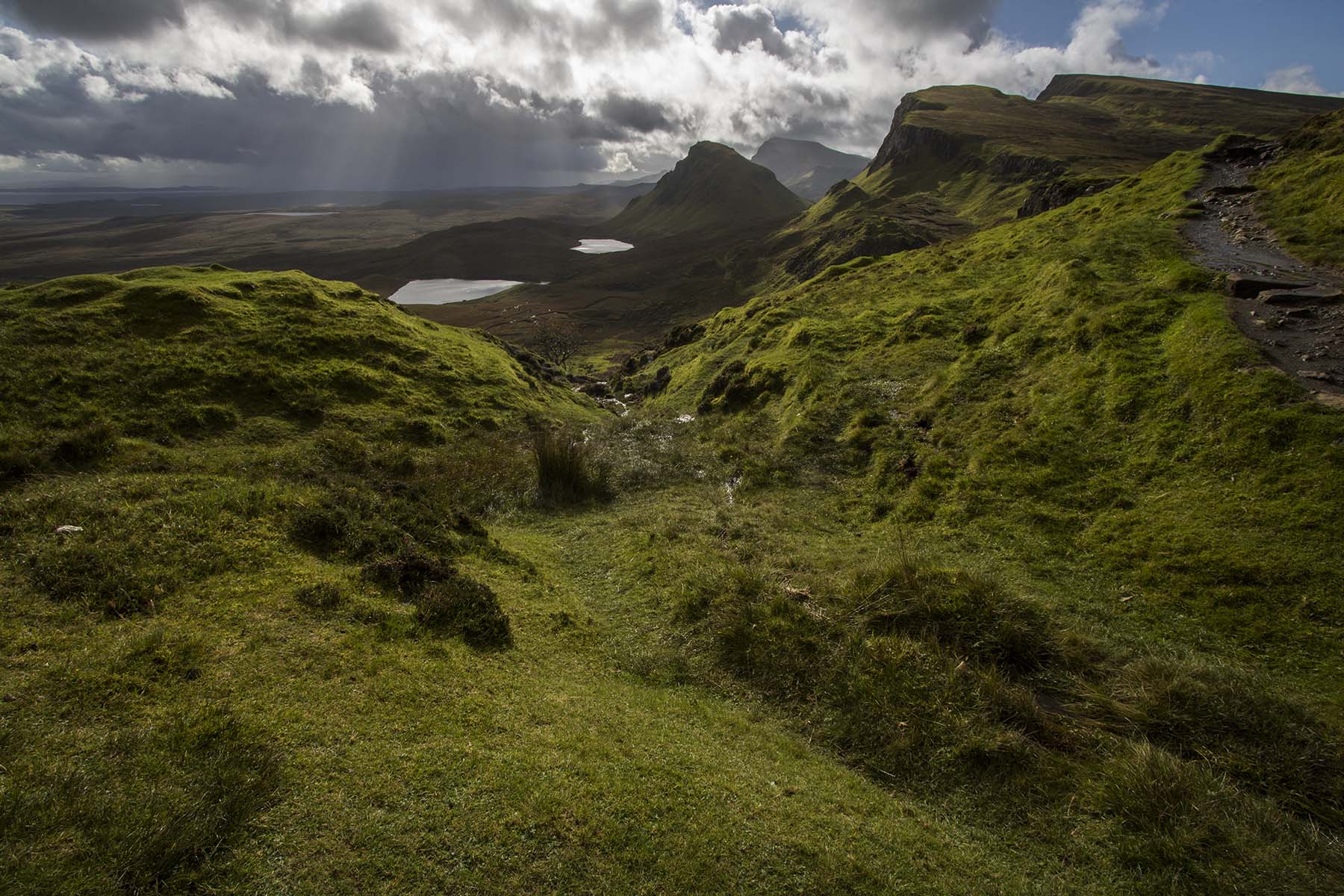IMG_2442QuiraingLookingDown Published June 1, 2017 at 1800 × 1200 in Isle of Skye (Part 2) – the Quiraing, Culnacnoc & Portree The sun determined to shine on the Quiraing, Isle of Skye, Scotland